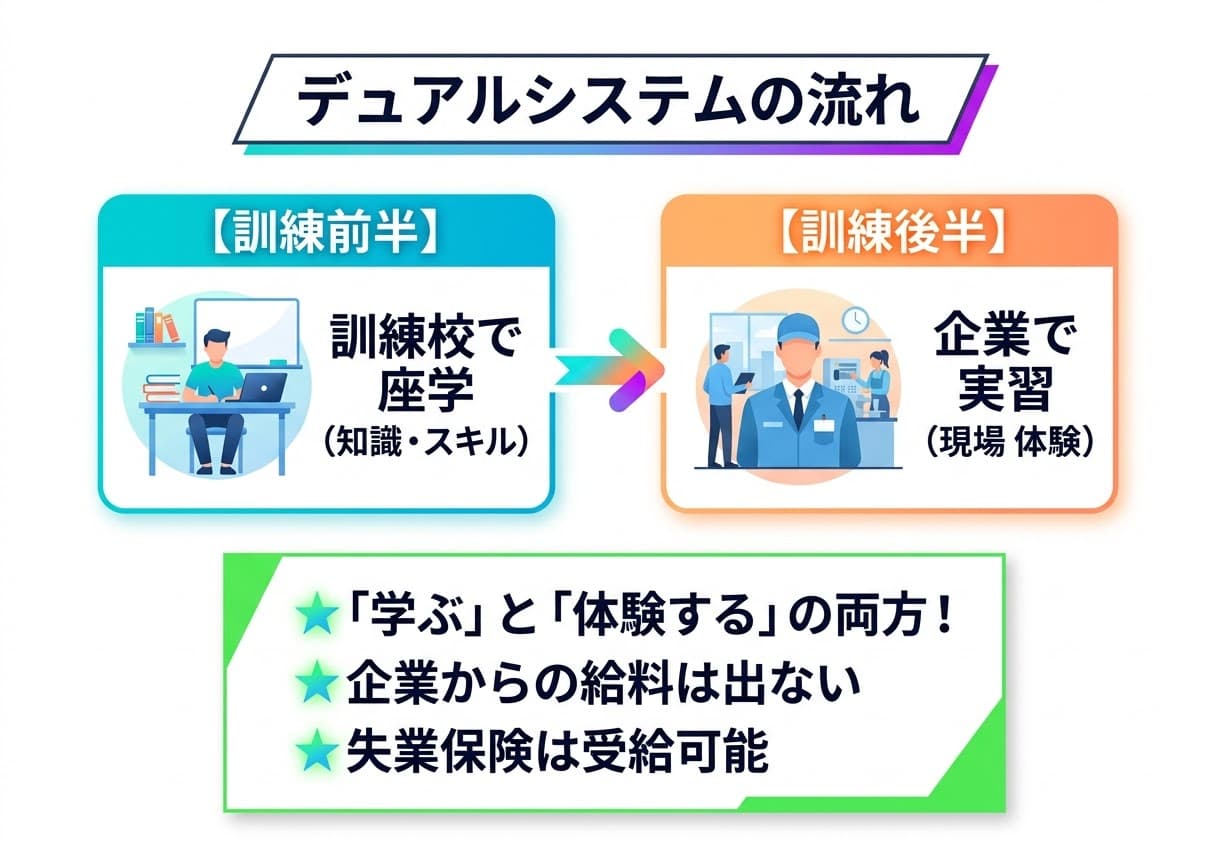 ※東京都の場合は「東京都委託訓練活用型デュアルシステム」という名称で実施されています。名称は地域によって異なりますが、基本的な仕組みは共通しています。