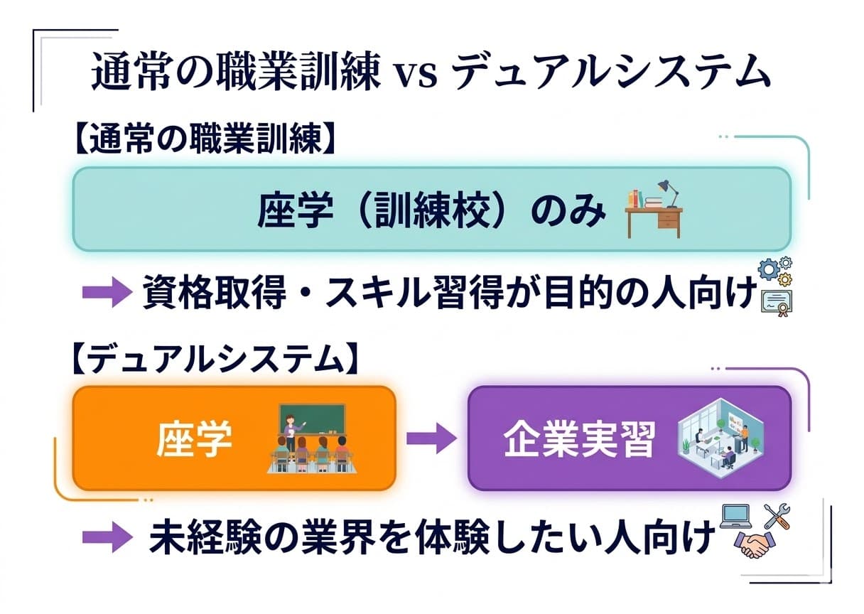 「通常の職業訓練とデュアルシステム、どちらを選ぶべきか」で悩む方も多いので、違いを整理しておきます。