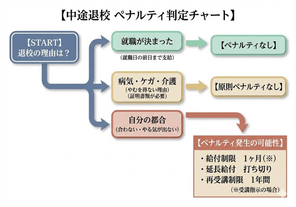 すべての場合にペナルティがあるわけではありません。就職が決まった場合や、病気・ケガ・家族の介護などやむを得ない理由での退校では、原則としてペナルティは発生しません。ペナルティが生じるのは、やむを得ない理由に該当しない自己都合退校の場合です。