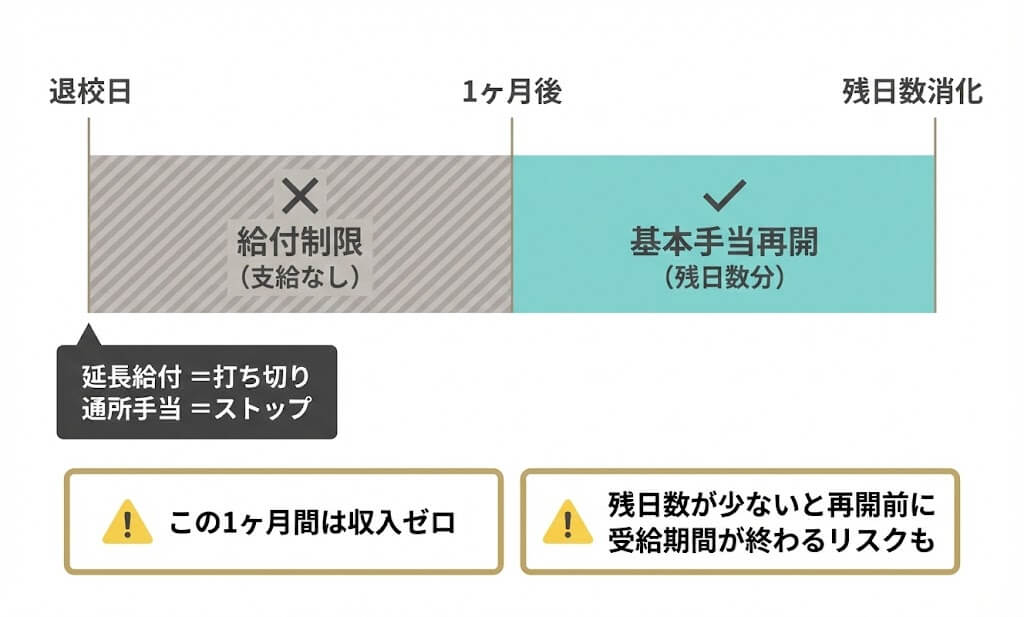 - 退校した翌日〜1ヶ月後:基本手当が支給されません。残日数はあっても受け取れない状態です