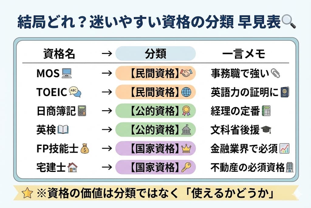 しかも困ったことに、ネット上の情報はサイトによって分類がバラバラ。あるサイトでは「簿記は公的資格」と書いてあるのに、別のサイトでは「民間資格」と書かれている。これでは混乱するのも当然です。