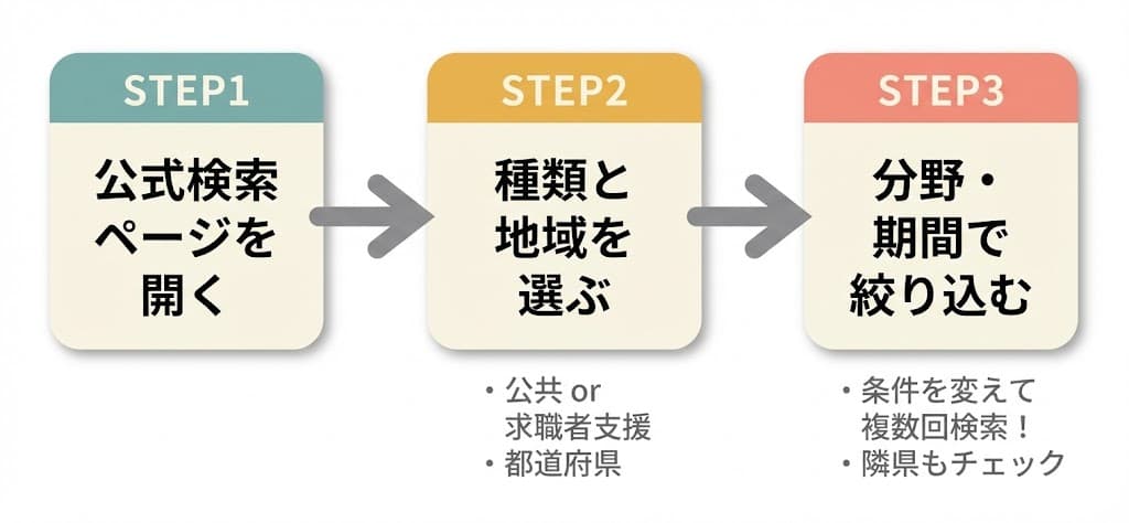 ハローワーク公式の職業訓練検索ページで、地域・分野・開講時期を指定して検索できます。条件を変えて複数回検索すると、希望に近いコースが見つかりやすくなります。