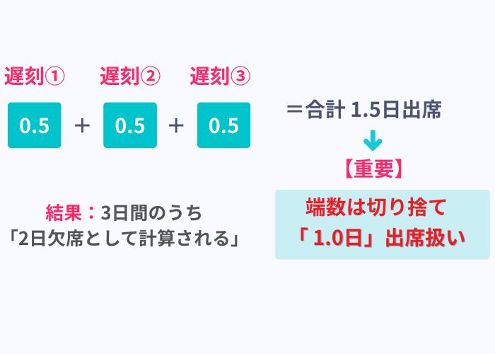 - 遅刻3回(0.5日欠席×3 = 1.5日欠席) = 1日欠席(0.5は切り捨て)